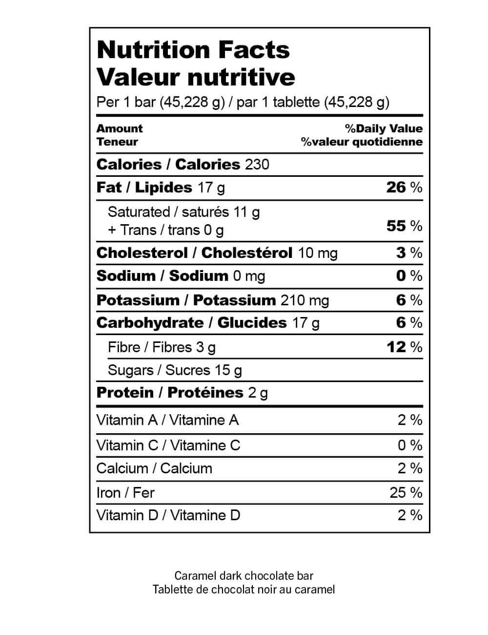 Ingrédients : chocolat (pâte de cacao, sucre, beurre de cacao, lécithine de soya, vanille naturelle) • caramel (sirop de maïs, sucre, lait, fructose, huile de coco hydrogénée, beurre, mono et di-glycérides, sel, lécithine de soya, vanilline) • amandes.