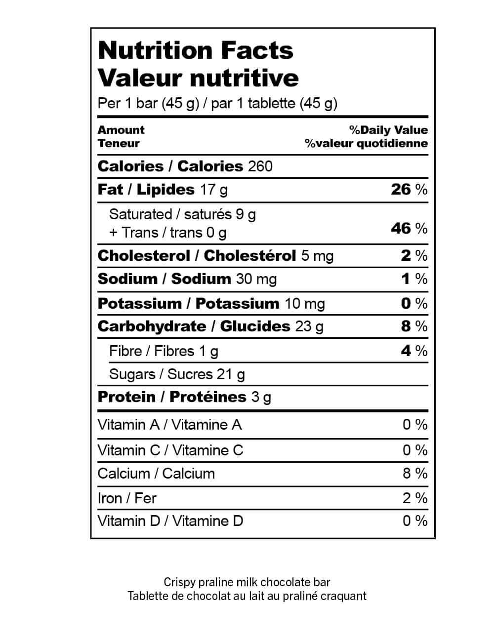Ingrédients : sucre • beurre de cacao • lait entier en poudre • pâte de cacao • noisettes • Rice Krispies™(riz, sucre, sel, extrait de malt de maïs et d’orge) • lécithine de soya • vanille naturelle.