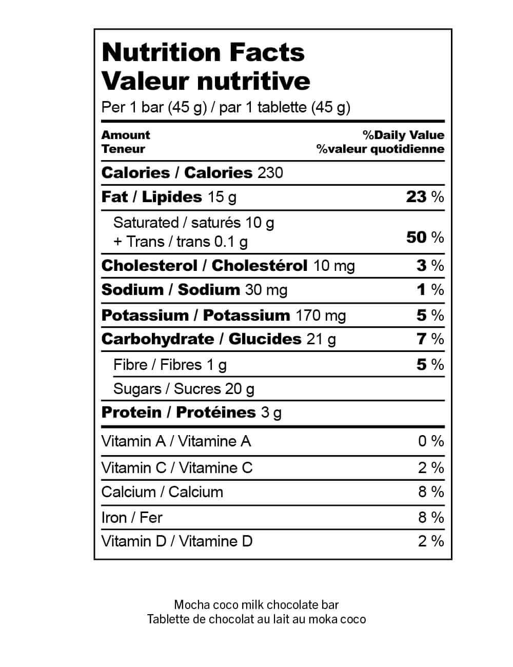 Ingrédients : sucre • beurre de cacao • lait entier en poudre • pâte de cacao • noix de coco non sucrée • grains d’espresso • lécithine de soya • vanille naturelle.